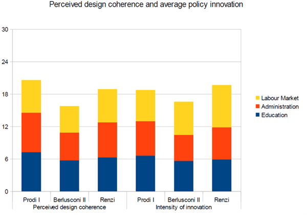 Questo grafico, elaborato da due scienziati politici italiani, mostra un confronto tra il più stabile dei due governi Prodi, il più stabile dei tre governi Berlusconi e il governo Renzi in relazione alla coerenza e alla capacità innovativa, in tre aree di policy, in base all’opinione di una quarantina di esperti “neutrali”.