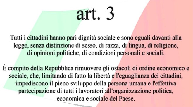 Se il punto di partenza è la dignità inerente a ogni membro della famiglia umana, ogni uomo è un valore, è chiaro che questo valore non può essere discriminato e non possono esistere gerarchie fra le persone nel godimento dei diritti. Per questo, recita l’art. 3 della Costituzione, «tutti i cittadini hanno pari dignità sociali e sono eguali davanti alla legge, senza distinzioni di sesso, di razza, di lingua, di religione, di opinioni politiche, di condizioni personali e sociali».